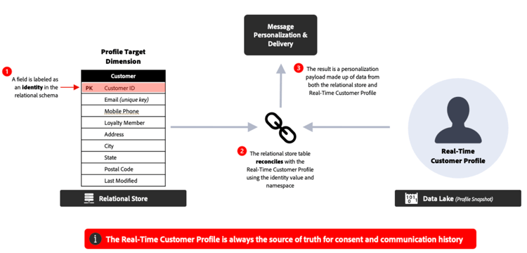 Campagne Orchestration in Adobe Journey Optimizer gebruikt een relationele database. Dit type van gegevensmodel heeft afzonderlijke schema's van gegevens die via 1 :1 of 1 :many verhoudingen worden verbonden. Dit laat gebruikers toe om een vraag op om het even welk schema te beginnen - niet alleen op ontvankelijk niveau - en dan terug en uit te keren naar andere verwante regelingen, zoals aankopen, producten, boeken of ontvankelijke details die grote flexibiliteit in verstrekken hoe de segmenten en het publiek kunnen worden gecreeerd en