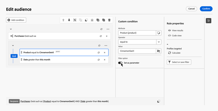 Vooraf gedefinieerde filters zijn opgeslagen regels die u opnieuw kunt gebruiken in de regelbuilder. Gebruik hen om het herbouwen van gemeenschappelijke vragen te vermijden en het richten logica over georkestreerde campagnes te standaardiseren.
