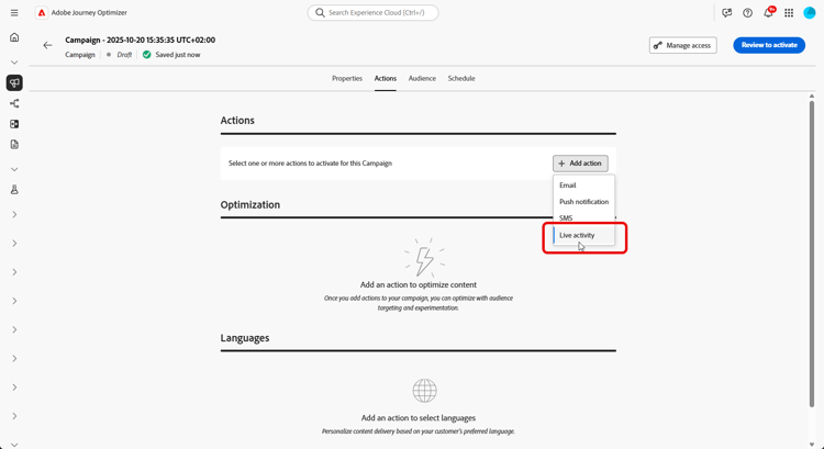 Kies Actions in de sectie Live activity en selecteer of maak een nieuwe configuratie.