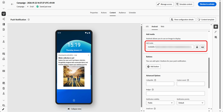 Als u eenmaal een pushmelding hebt gemaakt, kunt u de inhoud ontwerpen voor iOS- en Android-platforms. Deze pagina begeleidt u door het samenstellen van uw bericht, het configureren van gedrag bij klikken, het toevoegen van media en knoppen en het instellen van geavanceerde opties om aansprekende pushberichten te maken die op uw publiek passen.