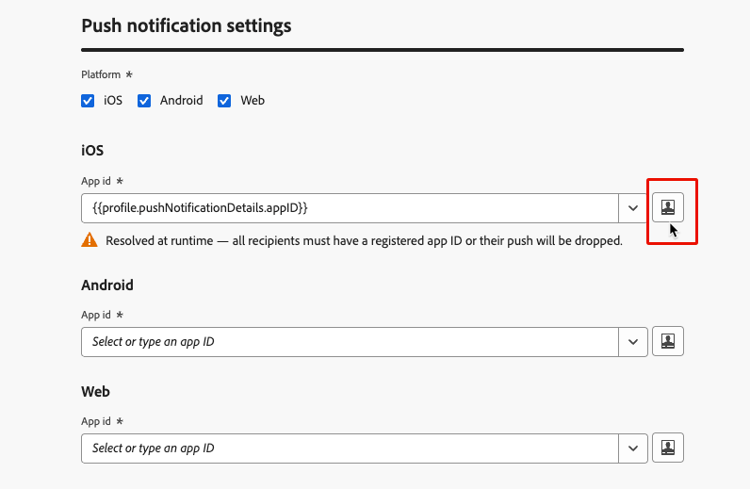 Voor App id, selecteer de waarde die uw duw credential aanpast. U kunt ook personalisatie gebruiken om veel toepassingen van de ene reis naar de andere of naar de andere campagne te sturen. Leer meer