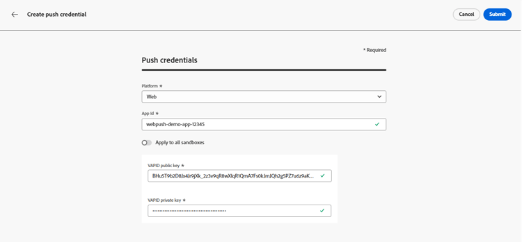 Voer de VAPID public key en private key in.