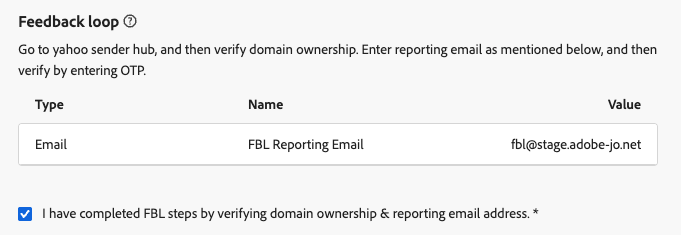Voer vervolgens de stappen van de feedbacklus uit om het eigendom van het domein te verifiëren en het e-mailadres te melden.