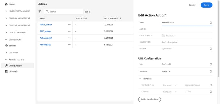 Als u een derdesysteem gebruikt om berichten te verzenden of als u reizen API vraag naar een derdesysteem wilt verzenden, gebruik douaneacties om zijn verbinding aan uw reis te vormen. Bijvoorbeeld kunt u met de volgende systemen met douaneacties verbinden: Epsilon, Slack, Adobe Developer , Vuurbasis, enz.