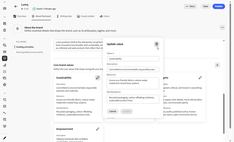 toevoegen om de kernwaarden van het merk toe te voegen en de details in te vullen:-