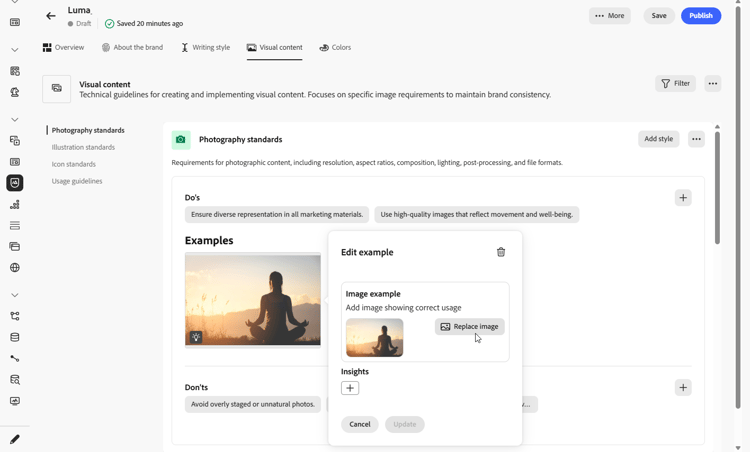In de sectie Visual Content worden de standaarden voor afbeeldingen en ontwerpen gedefinieerd, waarin de specificaties worden beschreven die nodig zijn om een uniform en consistent merkgebruik te behouden.