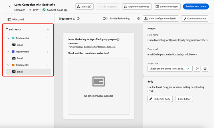 Maak verschillende behandelingen en herhaal de bovenstaande stappen om te importeren en gebruik snel de andere variaties in de e-mailervaring die u hebt gemaakt in GenStudio .