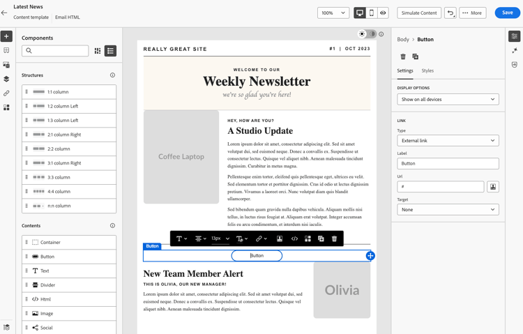 Met Journey Optimizer kunt u het maken van e-mailberichten aanzienlijk versnellen door statische afbeeldingsontwerpen om te zetten in volledig aanpasbare, modulaire HTML-sjablonen voor e-mailinhoud.