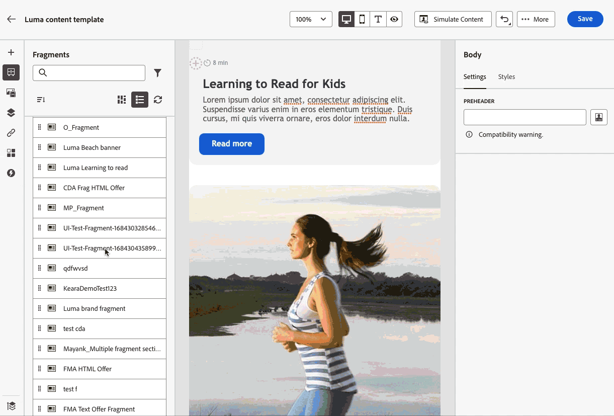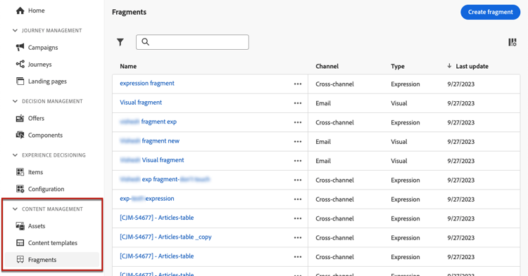 - creeer uw eigen fragmenten: Creeer visuele of uitdrukkingsfragmenten, of van kras of door inhoud als fragment op te slaan. Leer hoe te om een fragment tot stand te brengen. Bovendien kunt u hefboomwerking Journey Optimizer Inhoud REST API gebruiken om inhoudsfragmenten te beheren. Voor meer op dit, verwijs naar de documentatie van Journey Optimizer APIs .
