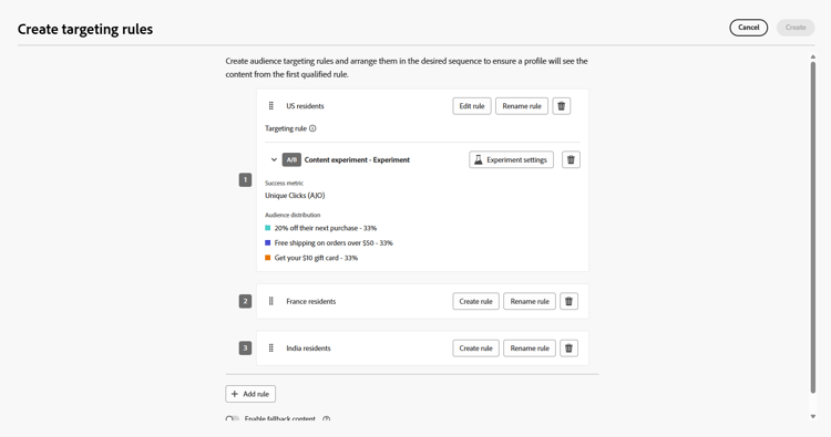 U kunt doelgericht gebruiken om verschillende varianten te maken. Voor elke variant kunt u experimenteren om elke inhoud verder te optimaliseren. Dit zorgt ervoor dat de experimenten voor elke het richten regel specifiek zijn en zich niet over varianten uitstrekken.