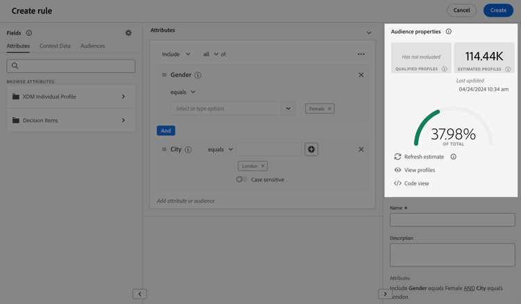 Terwijl u nieuwe velden toevoegt en configureert in de werkruimte, wordt in het deelvenster Audience properties informatie weergegeven over de geschatte profielen die bij het publiek horen. Klik op Refresh estimate om gegevens bij te werken.