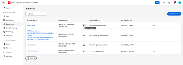 Maak een nieuwe gegevensstroom via het menu Data Collection > Datastreams . Leer hoe te om gegevensstroom in de gids van Gegevens van Adobe Experience Platform tot stand te brengen en te vormen