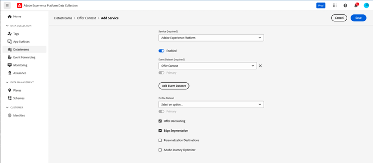 Bewerk de zojuist gemaakte gegevensstroom en selecteer "Adobe Experience Platform" als de service en "Context aanbieden" als de gebeurtenisdataset.