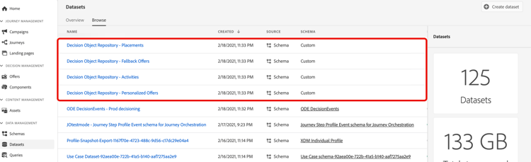 De geëxporteerde aanbiedingscatalogus is toegankelijk in het menu Adobe Experience Platform Datasets . Er wordt één gegevensset gemaakt voor elk object in de bibliotheek met aanbiedingen.