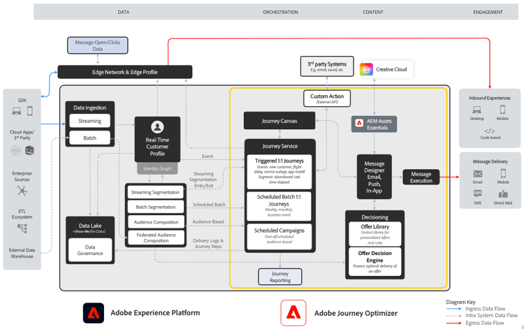 In het onderstaande diagram leert u de basisarchitectuur van Adobe Journey Optimizer , de integratiepunten en de relatie tussen Journey Optimizer en Experience Platform .
