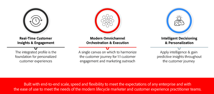 Intelligente Beslissing & Personalization - de merken kunnen gecentraliseerd besluit toepassen en kunstmatige intelligentie en machine het leren opnemen om voorspellende inzichten door de klantenervaring te vormen, die het gemakkelijker maken om besluiten te automatiseren en de ervaring op schaal te optimaliseren. Met beslissingsbevoegdheden worden gecentraliseerde aanbiedingen via kanalen op schaal Adobe Journey Optimizer mogelijk gemaakt.