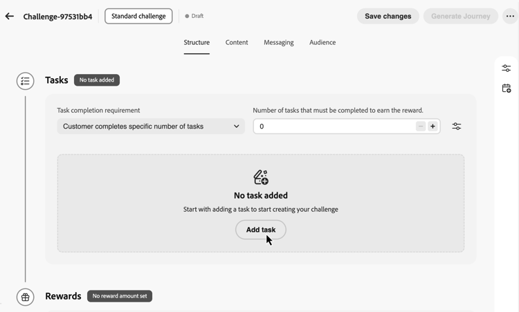 Definieer op het tabblad Structure hoe de uitdaging is ingedeeld: de eigenschappen, het schema, de taken die moeten worden voltooid en de beloningen die moeten worden geleverd.