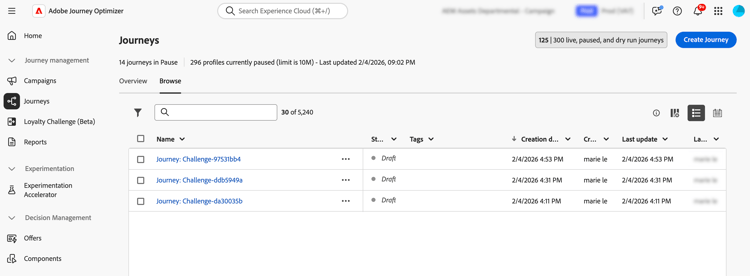 Journey Optimizer maakt automatisch een reis in de status 'Concept'. De reis verschijnt in uw reisinventaris met het naamformaat "Journey: [ Naam van de Uitdaging ]". leer meer over de reisinventaris .