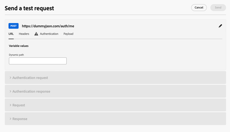 Om het Send test request vermogen te gebruiken, a douaneactie moet met een URL, kopballen, en authentificatiemontages worden pre-gevormd.