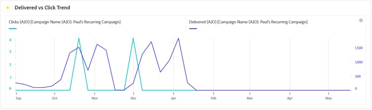 In de grafiek van Delivered vs Click trend wordt een gedetailleerde analyse gegeven van de betrokkenheid van uw profielen bij uw e-mails. Deze grafiek biedt waardevolle inzichten in de interactie tussen profielen en uw inhoud. In de grafiek worden twee assen gebruikt om geleverde e-mails weer te geven en naast elkaar te klikken. Hierdoor is het eenvoudiger om ongebruikelijke patronen of wijzigingen in de betrokkenheid te zien in vergelijking met het aantal e-mails dat is verzonden.