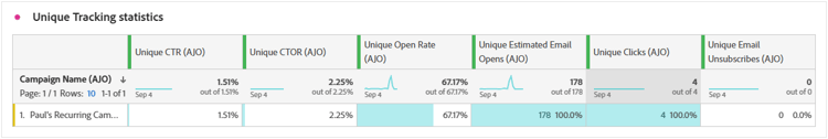 De tabel Unique Tracking statistics biedt een gerichte weergave van de betrokkenheid op profielniveau met de e-mails in uw campagne. Het benadrukt unieke metriek die waardevolle inzichten in hoe individuele profielen met uw e-mailinhoud over zeer belangrijke stadia van betrokkenheid interactie aanbieden.