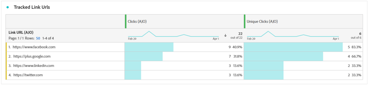 De tabel Tracked link URLs bevat een uitgebreid overzicht van de URL's in uw e-mail die het hoogste bezoekersverkeer aantrekken. Hierdoor kunt u de populairste koppelingen identificeren en er prioriteiten aan stellen, zodat u meer inzicht krijgt in de betrokkenheid bij profielen met specifieke inhoud in uw e-mails.