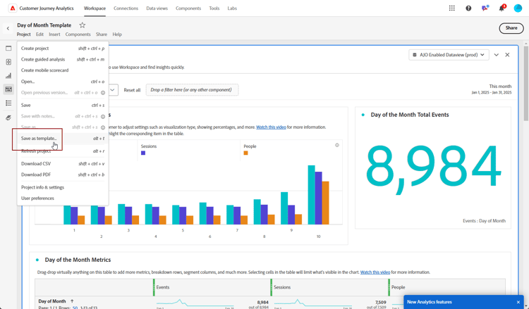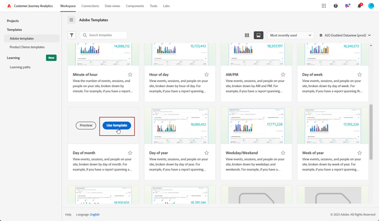 Navigeer in Customer Journey Analytics naar het menu Workspace en selecteer Adobe templates . leer meer over de beschikbare malplaatjes