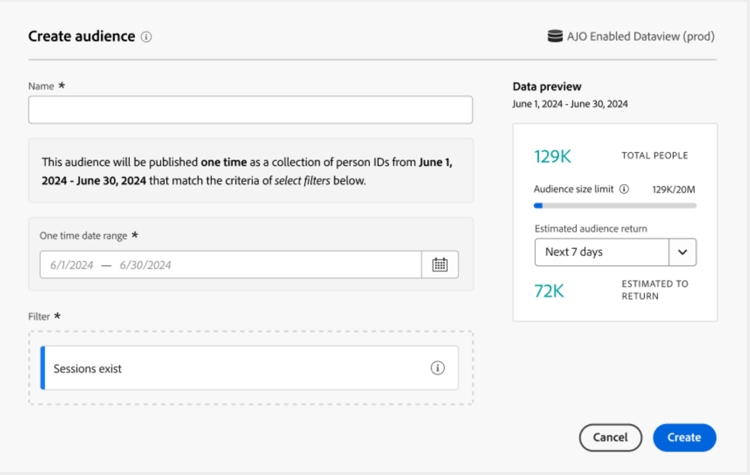 Voer in het venster Create audience een Name in en stel een One-time date range in voor het publiek dat u wilt publiceren.