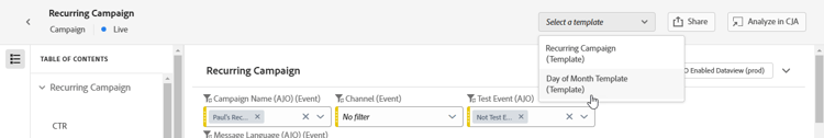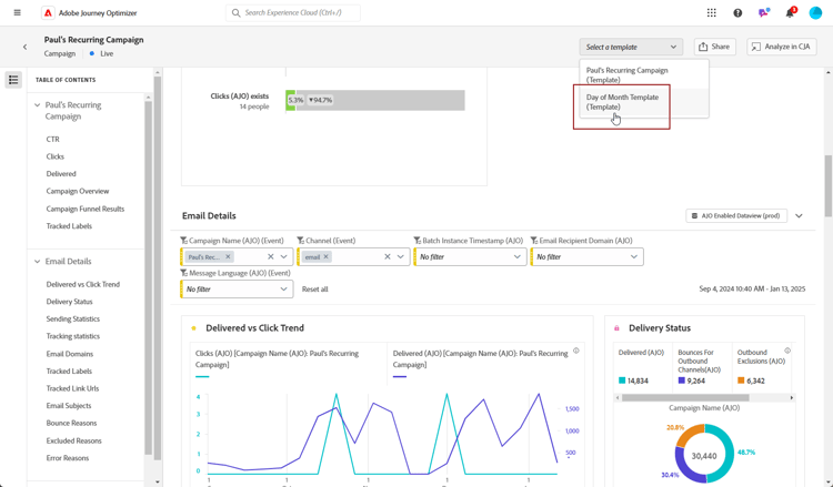 Open in Journey Optimizer uw rapport en kies de eerder gemaakte sjabloon in het vervolgkeuzemenu Select a template .