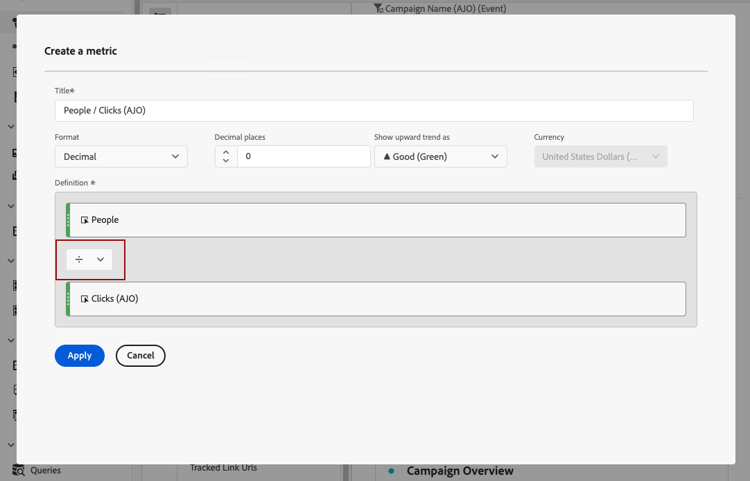 Selecteer de operator, zoals optellen, aftrekken, vermenigvuldigen of delen, die bepaalt hoe de metrische waarde wordt berekend.