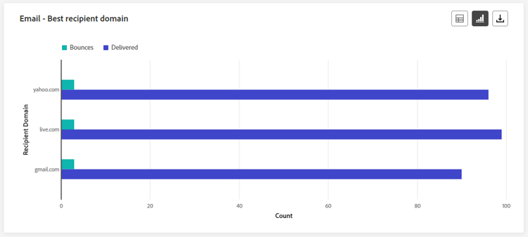 De grafiek en tabel van Email - Best recipient domain bevatten een gedetailleerde uitsplitsing van de domeinen die in profielen het vaakst worden gebruikt om uw e-mails in de afgelopen 24 uur te openen. Dit biedt waardevolle inzichten in profielgedrag, waardoor u beter inzicht krijgt in voorkeursplatforms.