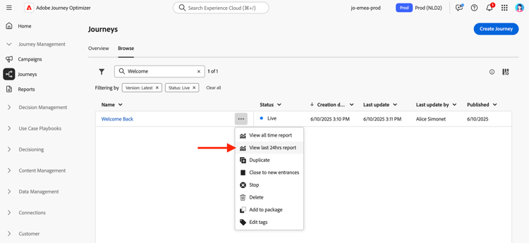Open het rapport Live Journey via het menu Journeys door het menu More actions van uw reis te openen en View last 24hrs report te selecteren.