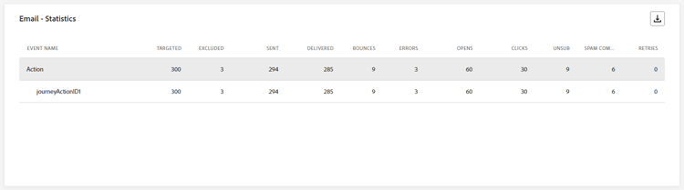 De tabel Email - Statistics bevat een uitgebreid overzicht van de belangrijkste gegevens over e-mails tijdens uw reizen in de afgelopen 24 uur. Het bevat belangrijke metriek zoals de grootte van het beoogde publiek en het aantal e-mails dat succesvol is afgeleverd. Het biedt waardevolle inzichten in de effectiviteit en het bereik van uw e-mails en reizen.