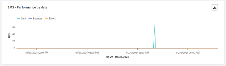 De SMS - Performance by date -widget biedt een gedetailleerd overzicht van belangrijke informatie met betrekking tot uw berichten, in een grafiek weergegeven, die inzicht biedt in de prestatietrends in de afgelopen 24 uur.