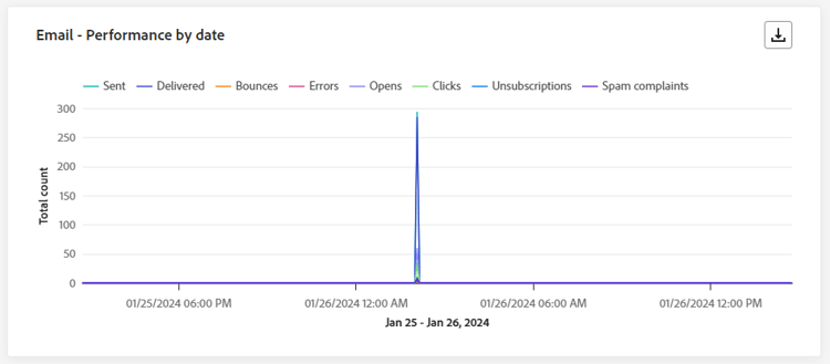 De widget Email - Performance by date biedt een gedetailleerd overzicht van belangrijke informatie over uw e-mails, in een grafiek weergegeven, die inzicht biedt in de prestatietrends in de afgelopen 24 uur.