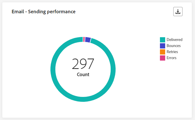 De grafiek van Email - Sending performance biedt een uitgebreide weergave van gegevens die betrekking hebben op verzonden e-mails tijdens uw reis en biedt inzicht in belangrijke metriek, zoals geleverde gegevens en stuitingen die zich in de afgelopen 24 uur hebben voorgedaan. Dit maakt een gedetailleerde analyse van het verzendingsproces van e-mail mogelijk en biedt waardevolle informatie over de efficiëntie en prestaties van uw reizen.