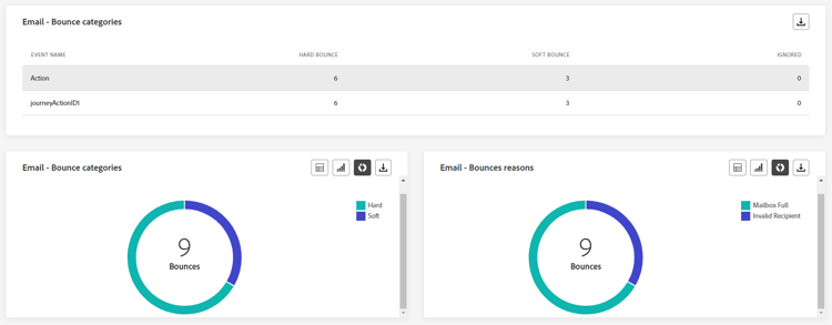 De widgets Bounce Reasons en Bounce categories compileren de beschikbare gegevens met betrekking tot verzonden berichten, die gedetailleerde inzichten verstrekken in de specifieke redenen en categorieën achter e-mailschommelingen in de afgelopen 24 uur.