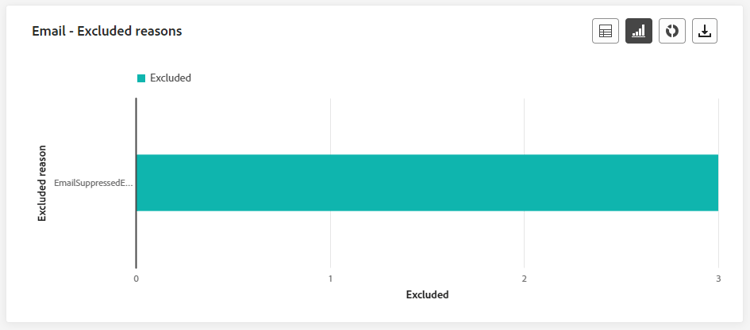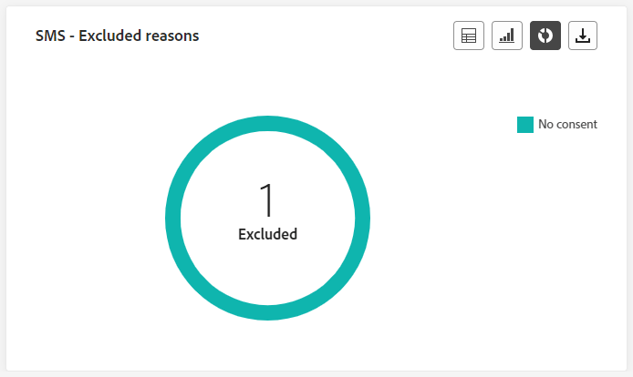 In de grafieken en tabel van SMS - Excluded Reasons worden visueel de verschillende factoren weergegeven die ertoe hebben geleid dat gebruikersprofielen zijn uitgesloten van het doelpubliek, zodat gebruikers uw SMS-berichten niet kunnen ontvangen.