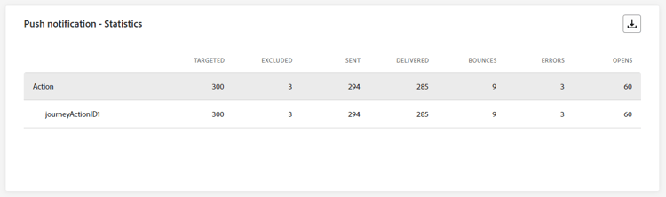 De tabel van Push notification - Statistics bevat een beknopt overzicht van de belangrijkste gegevens met betrekking tot uw pushberichten, waaronder belangrijke meetgegevens zoals het aantal gerichte berichten en het aantal berichten dat succesvol is bezorgd in de afgelopen 24 uur.