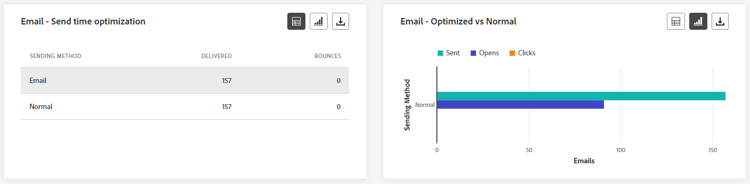 De widgets Send time optimization en Optimized vs non optimized geven een gedetailleerd overzicht van het succes van uw e-mails, afhankelijk van de verzendmethode: geoptimaliseerd of normaal.