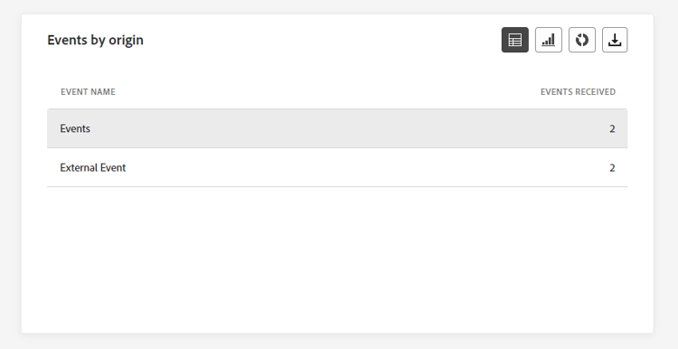 De Events by origin -tabel en -grafieken bieden een gedetailleerd perspectief op de succesvolle ontvangst van uw gebeurtenissen in de afgelopen 24 uur. Via deze visuele voorstellingen kunt u precies zien welke van uw gebeurtenissen effectief zijn ontvangen en kunt u waardevolle inzichten bieden in de prestaties en de impact van individuele gebeurtenissen op uw reis.