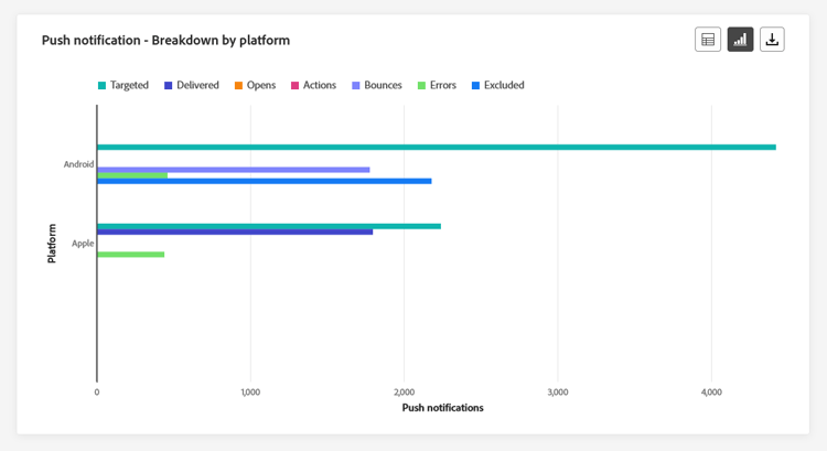 De grafiek en tabel van Push notification - Breakdown by platform bieden een gedetailleerde analyse van het succes van uw pushberichten en bieden inzichten op basis van het besturingssysteem van uw profiel. Deze ineenstorting verbetert uw inzicht in hoe goed uw pushberichten op verschillende platforms presteren.