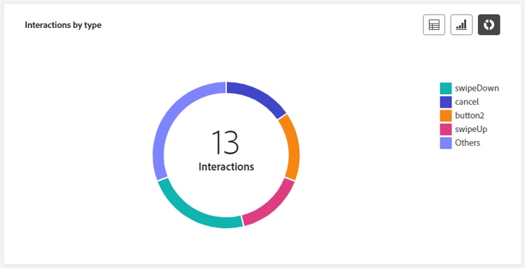 In de Interactions by type -grafieken en -tabellen wordt aangegeven hoe gebruikers met uw In-app-bericht hebben gewerkt door muisklikken, verwijderen of interactie bij te houden.