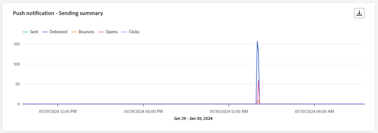 De grafiek van Push notification sending performance biedt een uitgebreid overzicht van gegevens met betrekking tot pushmeldingen die in de afgelopen 24 uur zijn verzonden. Het biedt inzicht in essentiële metriek zoals geleverde en stommelingen, waardoor het verzendingsproces van pushberichten grondig kan worden onderzocht.