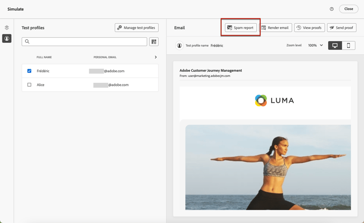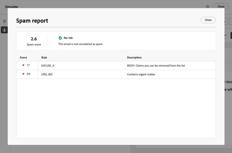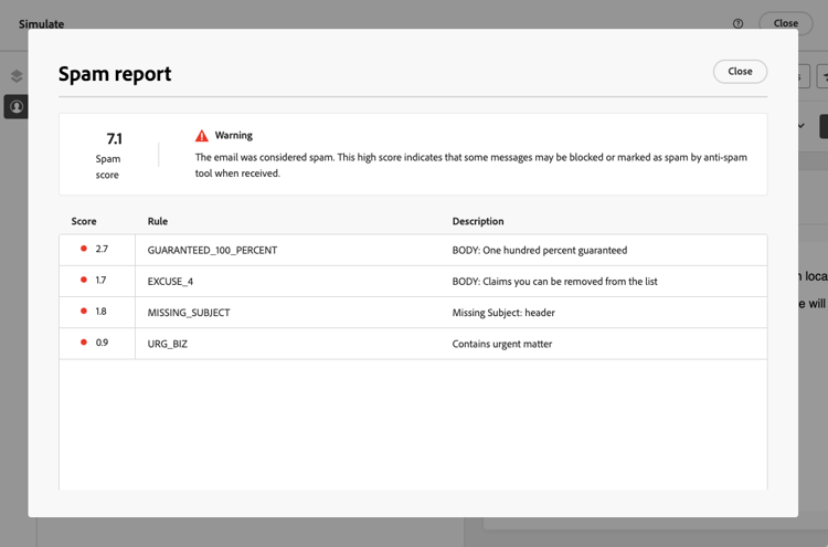 U kunt de spamscoring in uw e-mailinhoud controleren in een speciaal Spam-rapport. Gebruikend SpamAssassin , kan Adobe Journey Optimizer uw e-mailinhoud testen en het een score geven om erop te wijzen als ISPs of de leveranciers van de Brievenbus het als spam of niet zullen beschouwen.