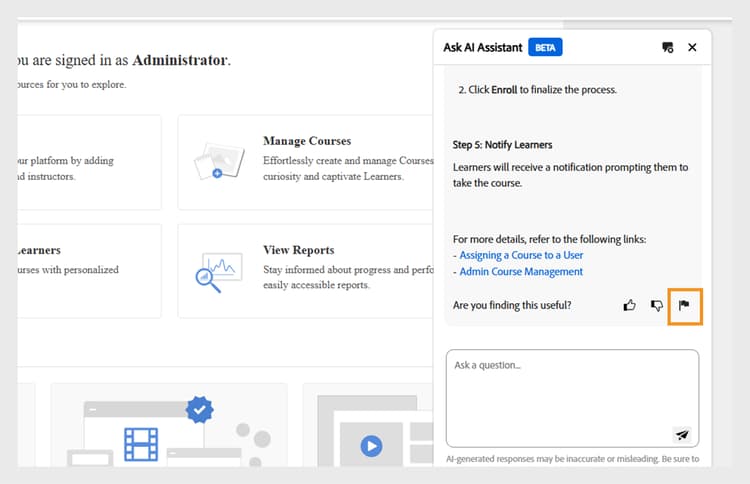 De AI-mogelijkheden van de Adobe worden gebruikt om zoekopdrachten in natuurlijke talen mogelijk te maken voor alle leerinhoud en systeemworkflows. De beheerders kunnen vragen zoals stellen hoe te om gebruikers aan Adobe Learning Manager toe te voegen of hoe te om het Leren Wegen toe te voegen. De Admin AI Medewerker van Adobe Learning Manager (Bèta) wordt uitsluitend opgeleid op openbaar beschikbare, Adobe-bezeten documentatie zoals, middelen die op Experience League worden ontvangen. Het leert niet van of heeft geen toegang tot de inhoud van de klant, het interne trainingsmateriaal, of user-generated data.