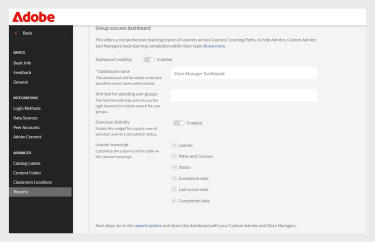 Een beheerder kan de dashboards inschakelen en maken door er een naam aan te geven, gebruikersgroepen te selecteren en de cursussen of leerpaden te kiezen. De dashboards kunnen met andere beheerders of managers worden gedeeld.