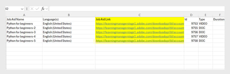 het Rapport van de Hulp van de Baan toont directe downloadverbindingen, die het gemakkelijk maken om tot taakhulpen in Adobe Learning Manager toegang te hebben en te downloaden