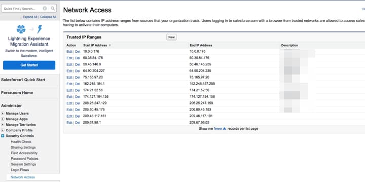 Als u Marketo Measure IP's wilt toevoegen aan de vertrouwde IP-bereiken in Salesforce, klikt u op Setup > Administration Setup > Security Controls > Network Access > New .