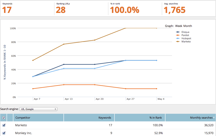 In dit rapport kunt u zien hoe u en uw concurrenten in de loop der tijd op trefwoorden worden gerangschikt.
